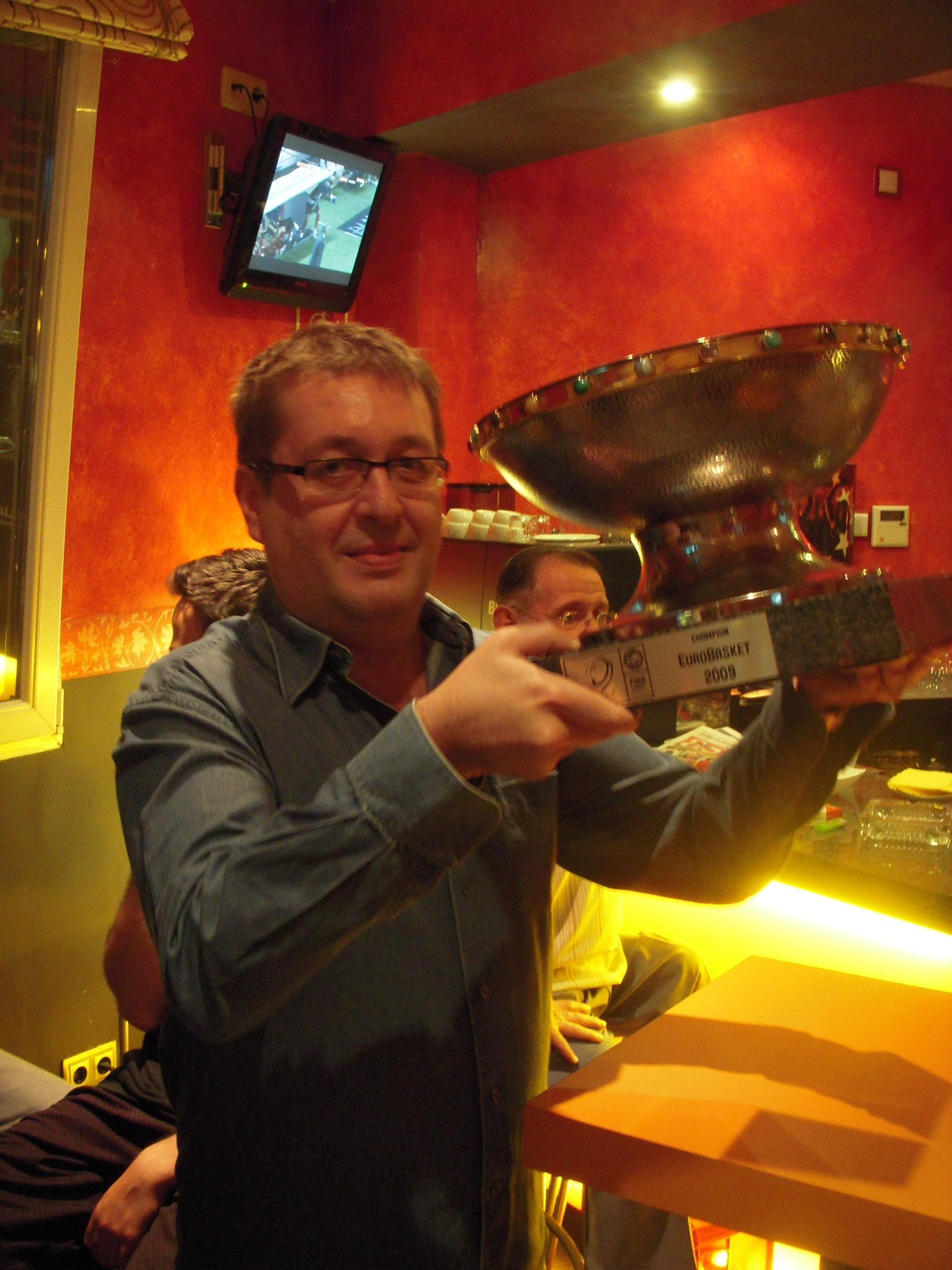 - No es la copa del Eurobasket sino la del campeonato de mus organizado por el Pub Charla, y le han puesto una pegatina del Eurobasket 2009. Y ni siquiera lo ganó este sujeto sino el señor de gafas que está detrás.