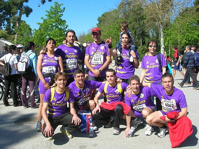 Y como de ilusión hablamos hoy, me voy a referir a la que pusieron un grupo de amigos de Macotera (Salamanca), que organizando una carrera popular y solidaria, la San Rocada, decidieron formar su propio club de atletismo. Reclutaron a más aficionados en el pueblo, hoy ya suman 56 y creciendo. Y también captaron patrocinadores para costear sus sueños, porque lo que más asombra es su puesta en acción: en poco más de un año han tomado parte en cerca de ¡70 carreras!, desde la Carrera del Turrón de Ciudad Rodrigo hasta los 20 Km de Bruselas, pasando por la Media Maratón de Madrid (en la foto), la San Silvestre Salmantina o varios de los principales maratones del calendario nacional. A cada una han enviado una representación, mayor o menor, siempre con sus camisetas moradas, sus caritas hinchadas de frío+agotamiento+felicidad y sus ganas de zamparse el mundo a zancadas, que lo demás ya se lo zamparán después. En su página web –Atletismo Macotera– luego lo cuentan y cuelgan sus fotos. Además incluyen una excelente sección de noticias sobre atletismo, artículos de interés, planes de entrenamiento… También han creado su página en Facebook y, en definitiva, lo que quieren es compartir su pasión por correr con todos en cualquier parte del mundo, y no tienen meta. Es cuestión de forma, pero sobre todo de fondo.
