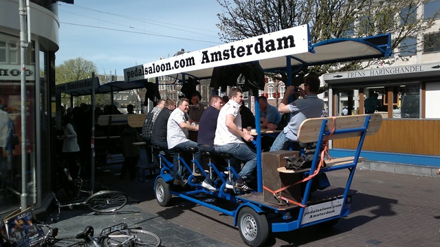 Pues fruto de todo ello, aquí tenemos este nuevo producto de la ingeniería holandesa: el bar a pedales, y nunca mejor dicho. Por Amsterdam este fin de semana vimos circular más que unos cuantos. Y todos felices, dándole a la cerveza, a los cigarritos y al pedal, y más cerveza, más cigarritos y claro, más pedal. Podría hasta ser recomendable –que se pronuncien los expertos- para consumir a la vez que engrosamos las dichosas calorías, o para mitigar los efluvios del alcohol. Pero me da que no. Bien mirado, y a pesar de su tradición ciclista y del ambiente que allí tienen todas las carreras, llevan años de capa caída. El último holandés en ganar un Tour fue Zoetemelk, hace más de 30 años. Y aunque lo suyo siempre han sido las clásicas de un día, el último campeón del mundo fue…Zoetemelk hace 26 años. Me temo que ya puedo intuir por qué. Pero para pasar una tarde, ¿a que la idea pinta muy bien?