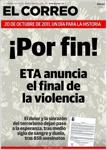 P.D. De los titulares de hoy en la prensa, pues a quién le pueden ya sorprender estos vaivenes. Mención especial a ese diario que suele titular una cosa en la web, que es la que se ve en todo el mundo, y otra muy distinta en la edición en papel, que es la que compran los adictos. Hay que ser ruin. Y es cierto, alguien lo ha dicho, que las imágenes carniceras de Gadafi han venido a estropear las portadas de un día histórico. La que traigo, porque no viene manchada y además por significativa, es la de El Correo. Pero en fin, como hoy es día de estar de buen humor, el titular con la que me voy a quedar es este de La Voz de Galicia: