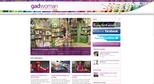 En Gadwoman hay de todo, bien visible y claro: productos a la última, Telefonía Móvil, Informática, Electrónica, Electrodomésticos, Videojuegos… secciones (en la Red, en casa, en el trabajo…), bancos de pruebas, colaboradores, un consultorio como no podía faltar en una revista femenina… ¿y del iPad? Sí, también hablan del iPad. Cosas sencillas y cosas sofisticadas, soluciones originales y sobre todo innovación. En definitiva, información práctica para las que entienden que todos estos inventos “sirven para hacernos la vida más fácil e incluso, muchas veces, más divertida y entretenida”. Tienen página en Facebook Gadwoman en Facebook, en Twitter, en YouTube… y aquí también van a estar desde hoy con enlace permanente. Para que entre quien quiera. Y yo mismo, claro.