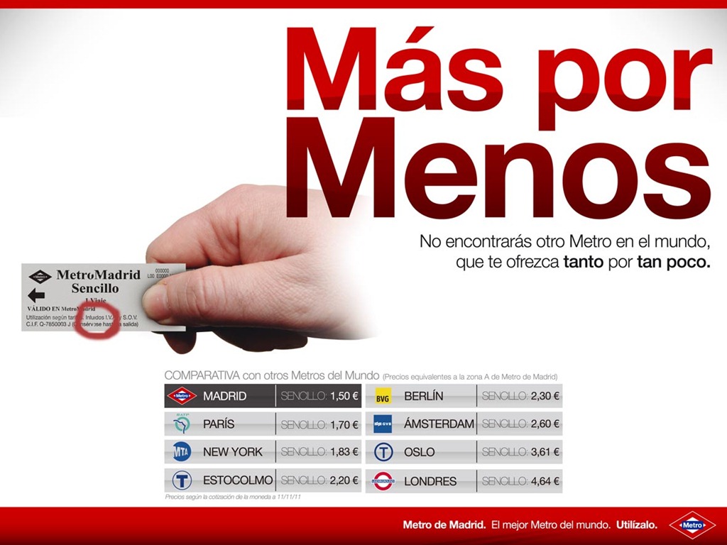 Pues sí, se ha retratado Metro de Madrid, y quien manda en ellos, con la campañita Más por Menos con la que nos abordan estos días por doquier haciéndonos ver lo barato que nos sale a los madrileños este medio de transporte. Y previniendo, que se les ve venir, una inminente y escalofriante subida de los abonos, ya verán. El caso es que no puede negarse que la campaña viene imbuida de un espíritu aleccionador, dirigido a diluir todos nuestros recelos, y a inculcarnos el concepto de economía práctica, como se deduce del “originalísimo” slogan, hasta el punto de despertarnos inlusión pues no en vano el billete sencillo lleva “inluido” el IVA y otros impuestos, casi nada. Que ya podemos todos ir corriendo a nuestros asesores fiscales a ver cómo podemos inluir el IRPF en nuestras facturas y en nuestra futura Declaración de la Renta, a fin de evitar que las últimas e “irremediables” subidas nos inluyan negativamente y en cambio nos inuflen el necesario ánimo en los tiempos que corren. Que digo yo que prisas tendrían por lanzar la campaña, por algo será, y ese es caldo de cultivo ideal para los duendes de imprenta, que tienden a escurrirse como Messi por más que les sometan a implacable marcaje, pero que encima encuentran campo libre y puertas abiertas cuando la defensa se tira hacia arriba llevada por la urgencia. Con todo, el mayor despropósito y falta de visión, la principal laguna táctica en que han incurrido los estrategas de la empresa pública radica en infravalorar al que tienen enfrente, esto es, al usuario. Que en Madrid, como en todas las ciudades, hay de todo, y hay mucha gente que, además de buenas gafas, tiene conocimiento, tiene mundo, y algunos hasta tienen rotulador.