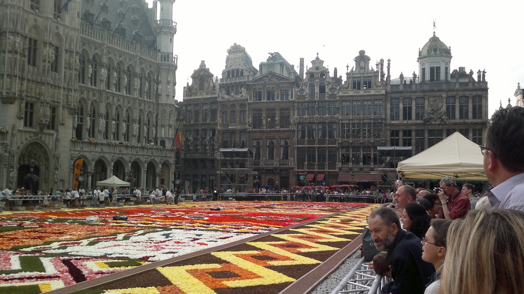 Pero vamos a lo importante, que esta vez va detrás de lo urgente. Ya decíamos que algo estaban preparando. Vamos a reconocer que, en el planteamiento inicial del viaje, el paso por Bruselas cumplía una función meramente técnica. Era el sitio por donde entraríamos y por donde saldríamos de Bélgica. Teniendo en cuenta que llegábamos un lunes muy tarde, que queríamos alargarnos hasta Lieja, desde allí más accesible, y que siempre cualquier excusa es estupenda para hacer una parada en ese monumento coral que es la Grand Place, se justificaba alargar la estancia en la capital un día más. Lo que no nos esperábamos era esto. La estación central de trenes está a un tiro de piedra de este enclave, y nuestro hotel a dos tiros por el otro lado. Así que vamos a estar pasando por la Grand Place como quien cruza la calle para ir de casa al colegio y del colegio a casa. Por la mañana, algo seguía tramándose. Por la tarde, de vuelta de la estación, ya lo habían hecho: el espectáculo. La plaza cubierta por la inconmensurable alfombra de flores que tantas veces habías visto en las postales, en las guías, en cualquier foto o cartel de presentación de esta ciudad. A ser sinceros, nos felicitamos de encontrárnosla así y por supuesto nos hicimos sitio a empujones para sacarle fotos, pero la verdad, tampoco éramos conscientes de lo especial del momento. Pensábamos que esto era más habitual. Y luego ya supimos que la celebrada escena no se repite más que unos pocos días de agosto… cada dos años. Ahora ya sabemos que fue una gran decisión quedarnos un día más aquí, vamos que lo hemos clavao. Si lo hacemos adrede, no nos sale igual.