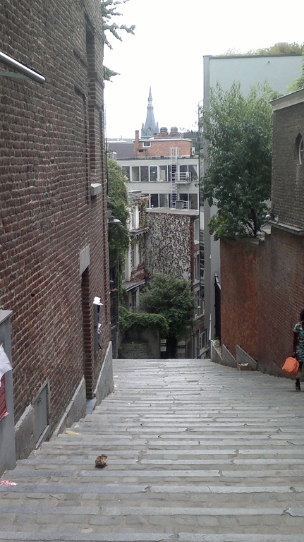 Y antes de que pasara todo esto, el argumento principal del día, ya digo, era Lieja, Liège o Luik, que aunque se use menos este último nombre, viene bien saberlo para encontrarlo en los paneles de horarios de salidas en holandés. Se tratará de nuestra única incursión en Valonia, si exceptuamos la dual Bruselas. Esto significa que aquí los letreros sólo se exhiben en francés. Una hora de tren nos permite apreciar que, en efecto, este país tiene “montañas” por su flanco Este. Esto es, ligeras lomas que son las que dan lugar a los llamados muros, subidas cortas y muy empinadas que animan las clásicas ciclistas de las Ardenas y, por ejemplo, donde Induráin sembró una vez el pánico en el Tour de Francia, camino precisamente de esta ciudad. Que también tiene, por así decirlo, dos alturas. Paradojas de la geografía y de los usos, lo mismo que en Argentina le llaman cerro a un colosal pico de 4.000 metros cubierto de nieve perenne, aquí le llaman montaña a cualquier elevación del terreno. Y en Lieja es la de Bueren, donde reside la ciudadela, un nivel por encima del casco urbano en sí, y a la que se puede ascender, por ejemplo, por la Rue de la Montaigne, como no podía llamarse de otra manera. Echando unas cuantas gotas, desde luego.
