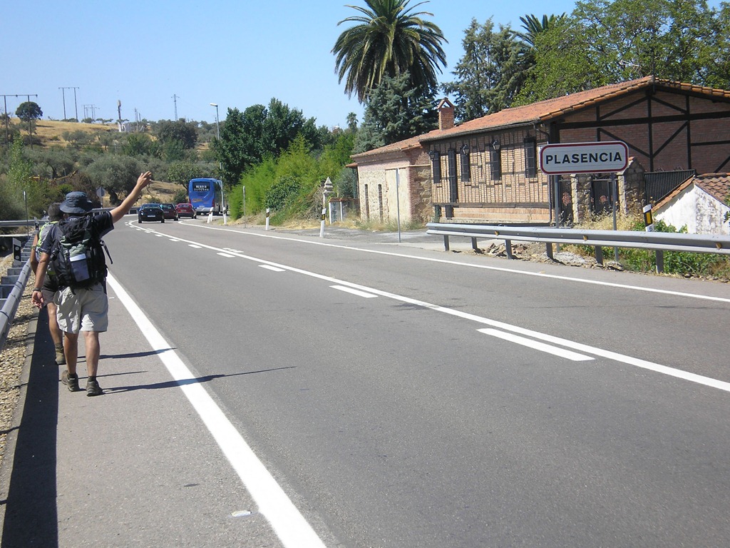 ¿O no lo está? ¿O es que somos inconformistas? O será que una especie de revelación del más allá nos dice que nos estamos desviando y que tenemos que salir de esa vía y tirar a la derecha. El emisor en cuestión de ese mensaje sobrenatural debió ser el espíritu de Manolete, porque por ahí nos vamos directamente… a los toros. De ahí los muros que delimitaban la anterior senda. Un morlaco, tres, dos más allá… y de pronto estamos rodeados. Miedo no tenemos -¡ni mucho menos!- pero tampoco estamos por la labor de salir hoy de aquí a hombros, y total si ya los veremos ahora que TVE vuelve a echarlos. Así que como quien no quiere hacer ruido nos vamos tirando más a la derecha, un poco más… y ya estamos en absoluto campo a través. Cierto que cuesta abajo, y la ciudad destino ya la tenemos ahí delante, lo que pasa es que ¿por dónde c… entramos? Una línea de arbustos, una especie de canal –que eso no es el Río Jerte-, y detrás naves industriales, después patios traseros de casas, perros ladrando… Desde luego no va a ser una entrada triunfal en Plasencia. Más bien lo definirá Anthony con meridiana precisión: “parecemos fugados de la cárcel”. Al fin vemos carretera, civilización… y una alambrada delante. Por arriba imposible, pero levantándola entre dos el tercero puede pasar arrastrándose. Pues eso, lo que ha dicho Anthony. Y esto ya es Plasencia, bueno, la carretera que lleva a tal. Como un kilómetro más adelante encontraremos la entrada oficial, esto es, la del camino que veníamos siguiendo y despreciamos, pues porque esto ha sido más emocionante, ¿o no?