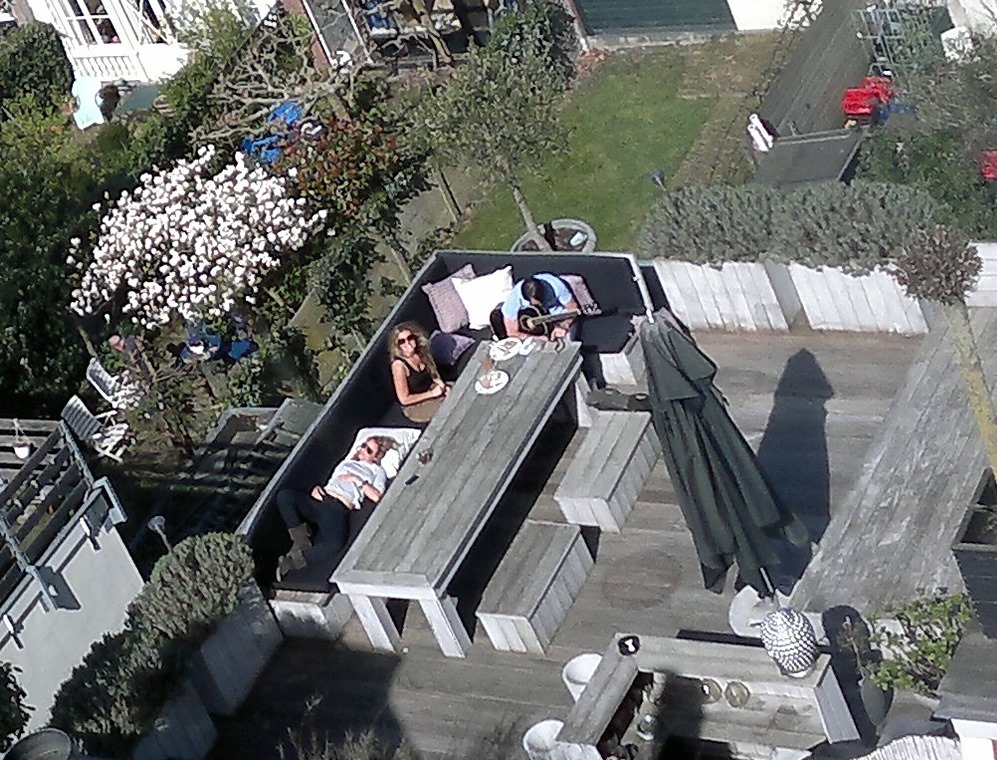 Esto no es una foto aérea de Google Maps, y estas personas –cuya intimidad no queremos importunar- son perfectamente anónimas o bueno, puedo asegurar que yo no las conozco. La chica que mira parece que advirtió al fotógrafo y le dedicó una sonrisa. O vete a saber. Para la que aparece tumbada, nada tiene la menor importancia en un momento sublime como este. Disfrutaban de una plácida y podríamos decir que inusitada tarde primaveral. Guitarra, cojines, un aparentemente cómodo sofá y los restos de lo que debió ser una socorrida merendola, al fin y al cabo una excusa para la íntima celebración de un día decididamente tranquilo. Algo de vino se vislumbra, o a lo mejor no era más que un café, que la distancia no da para más. Luego el entorno pone lo demás, las florecillas blancas, la hierba que no presta atención, toda esa paz que se respira, en la absoluta certeza de que nada más va a pasar aparte de lo que tengan planeado ellos tres.