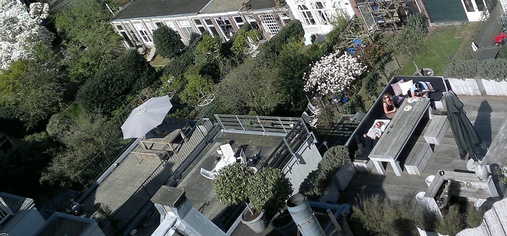 Volvemos a nuestro juego o, mejor dicho, a nuestro espacio alfresco que evocábamos la semana pasada Alfresco y sin presión, 3-5-2013. Ahora constatamos que estaban nuestros amigos solos, pero no porque tal soledad fuera inevitable. Tras ellos se extienden otros recintos exquisitamente dispuestos para estas fiestas privadas al uso. Posiblemente nuevas compañías estarán por llegar, que es sábado y todavía la tarde, y sobre todo luego la noche, pueden dar mucho de sí. Como bien observó el sagaz comentarista, aquí gobierna un clima húmedo y digamos que continental, y confirmamos que es temprana primavera del mes de abril. Toda esa verde armonía de formas y matices delata lo suyo, y el ambiente soleado ya es motivo de celebración. No debe ser casualidad que lo académicamente rematado se entienda con lo funcional, como tampoco ese aparente orden que parece que nadie ha establecido, sino que simplemente ha salido así. Pero no nos engañemos, cualquier protocolo se puede pasar por alto, como toda sangre se puede alterar o la pasión abrirse en canal. Y ya saldrá quien se atreva a ignorar las normas para meterse de lleno en un jardín. Que aunque ahora tengamos delante este, no nos faltará donde elegir.