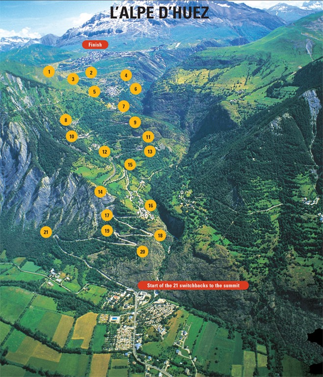 Hoy no puede decirse que sea la montaña más dura que se sube en el calendario ciclista, ya que la evolución de las bicicletas ha permitido afrontar carreteras de porcentajes más agresivos, antes insospechados: el Mortirolo, el Angliru o esas cuestas imposibles que cada año se inventan el Giro y la Vuelta a España. Pero el Alpe d’Huez mantiene intacto su carisma, y sigue presumiendo de que casi siempre ha sido decisivo, en sus famosas 21 curvas se han ganado y perdido muchas cosas que van del prestigio a la vergüenza. Se decía que el que salía de allí de amarillo ya lo mantenía hasta París, y toda regla tiene sus excepciones, pero en este caso son muy pocas: la primera tuvo que ser Perico Delgado en 1987, pero el segoviano se desquitaría justo al año siguiente, asaltando el liderato por segunda vez en aquella cima y esta ya hasta los Campos Elíseos. Y en fin, Thevenet, Hinault, Lemond, Induráin, Ullrich o Carlos Sastre, por citar algunos de los más ilustres que se pueden citar, dan fe de lo que significa salir bendecido del gran templo del ciclismo moderno.