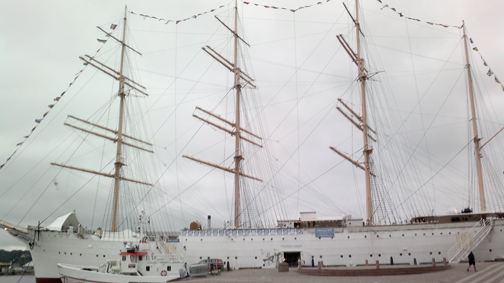 impronta remarcada por el día gris, con sus tranvías y sus amplias plazas, la principal montada sobre un canal. Por cierto que la construyeron holandeses, según parece porque tenían experiencia en levantar urbes sobre terrenos pantanosos e inestables. El barco vikingo de cuatro mástiles, que se divisa desde lejos, confiere personalidad a cualquier vista hacia allí orientada. Como ya hemos dicho que está de camino al hotel, nos pararemos un montón de veces ante él evocando hazañas, desembarcos, abordajes o incluso si habremos visto a Tejure por aquí. El lado no romántico de la historia es que en realidad fue construido en 1906 a semejanza de aquellos, fue buque escuela, vive atracado aquí desde 1950 y actualmente ejerce como restaurante y hotel.