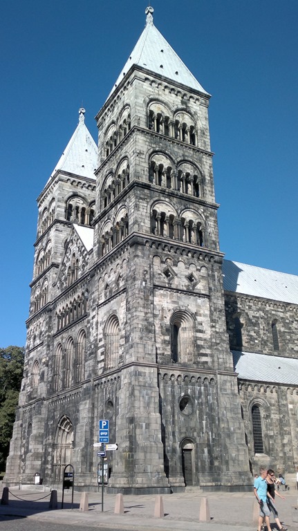 La mañana en Göteborg la habíamos empleado en un largo y estimulante paseo por el puerto, a lo largo de una de las orillas del Göta älv, no nos atrevimos a tomar el barco en parte por el tiempo, se había levantado soleado pero esos nublados venían traicioneros; y en parte por el tiempo, a las 12.00h teníamos que salir. Algo de pena nos da dejar el hotel flotante, y ya perfectamente conocido el camino a la estación, tras un apresurado almuerzo nos dimos a las tres horas de tren, que esta vez sí nos permitieron apreciar en buena medida el paisaje costero de esta parte baja del país. Nos suenan por diferentes motivos nombres de ciudades que pasamos como Bastad, Helsingborg o Landskrona. El viaje es una sucesión de orilla y bosque, verde y azul, nubes imposibles y súbitas apariciones, como la que nos sobreviene en los últimos veinte minutos de trayecto. Al llegar a Lund ya hemos recuperado la manga corta, Ernesto me ha recomendado el Stayat, que más que hotel son apartamentos, y allí estaré poco tiempo pero como un rey. Si algo falta, Emilio –nombre real y poco sueco- estará al quite, pero nada me va a faltar. Por cierto, está en Laboratoriegatan, calle del Laboratorio, en sueco las calles son gatan y las plazas torg. Primero en coche, después a pie por calles por supuesto empedradas, es un placer el aroma a sabiduría que se respira por cualquier rincón. La sede central de la Universidad, la Biblioteca, el Jardín Botánico, más y más facultades, los locales de las Nations, las organizaciones en las que se agrupan los estudiantes y organizan su vida social, casi todas con nombres de ciudades suecas. La Catedral, magnífica y rotunda, es del siglo XII y después leeré que se trata posiblemente de la obra románica más importante en toda Escandinavia.