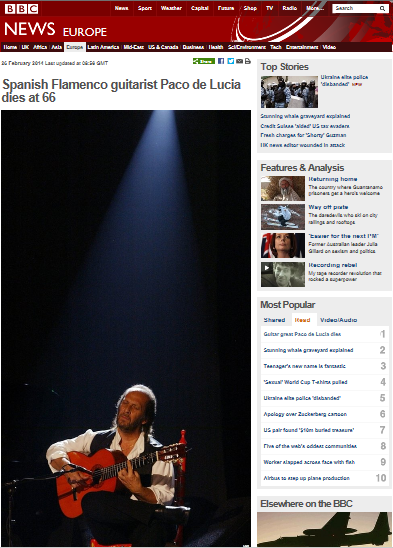 Paco de Lucía BBCTodavía habrá quien siga atento al inútil debate sobre el Estado de la Nación, ¿en qué mundo viven…? Pero la BBC, la CNN, las agencias y la prensa online internacional, de Estados Unidos a Hong Kong, están hablando ahora de que ha muerto de repente Paco de Lucía. No entendía, no estaba previsto, que hoy se haya levantado lloviendo en Madrid, y al conocer la noticia a las nueve en punto lo he comprendido todo. Es una luz muy grande la que se apaga.