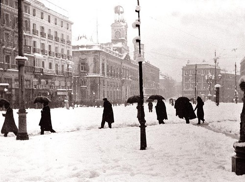 Llegado a la Puerta del Sol, aquello era una aparición. Medio metro de nieve cubría la célebre y celebrada explanada peatonal, ribetes blancos adornaban todos los salientes de los señoriales edificios; los tejados, las marquesinas y hasta el mítico reloj parecían haberse vestido de estreno. La escena era digna de disfrutarla y guardarla en la memoria, o por qué no en la del móvil. Por mucha prisa que tuvieras, merecía la pena pararse y quedarse un rato mirando. No se recordaba haberla visto así. Se veía a la gente divertida a pesar del frío, se tiraban bolas, se lanzaban literalmente en plancha sobre el flamante elemento, era un gusto tomar un puñado y recrearse en la suave y reciene textura. Parecía todo tan nuevo…