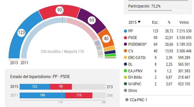 Por lo demás, el resultado de ayer no haya sido quizás tan impactante ni la inusitada expectación se ha visto correspondida como algunos esperaban. ¿El fin del bipartidismo? Vamos a ver, si analizamos los números, los dos grandes partidos de siempre han visto sensiblemente mermada su representación, de acuerdo, pero siguen acaparando el 50% de los votos y, amparados por la Ley electoral, ocupan 213 escaños, mucho más de la mitad. Los dos partidos emergentes, en cambio, se quedan con 109, esto es, no llegan a un tercio de la cámara. Es verdad que partiendo de cero pero ¿quién nos asegura que ese no vaya a ser su techo? Ah, ¿y qué me dicen de que 923.000 votos den para dos asientos en el hemiciclo? La impresión que da es que gran parte del aludido y solicitado voto indeciso se ha terminando decantado por lo malo conocido. Y por cierto, la participación terminó siendo elevada, pero no tan masiva como se podía prever. En definitiva, parece que al final han sido menos nueces para este tan esperado y se suponía histórico 20D.