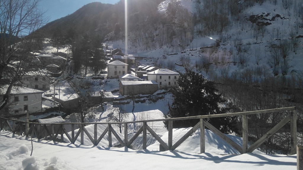No hemos hecho ningún pacto con el invierno, pero la mañana ha salido espectacular, el sol hasta pica en la frente y pisar la nieve será un lujo para ciertos paletos de Madrid. A partir del cruce que deja el cauce del río Pigüeña, un túnel ya avisa de que la cosa se va a poner sería. La carretera se ribetea de blanco y las paredes de roca se iluminan por momentos, se van abriendo como compuertas que franquean el paso, no sin algún reparo. Es tierra de lobos y osos, pero personas en esta época del año las justas. Villarin es un barrio de la comarca de Veigas, que toda ella tiene 68 habitantes y 45 viviendas. No nos consta cuántas de ellas son teitos, pero por unos cuantos resbalaremos de foto en foto.