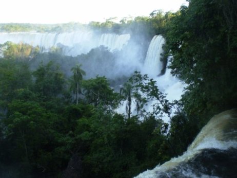 Por aire desistiremos de verlas, pero nos llenaremos de las Cataratas del Iguazú por tierra y por agua, de frente, de lado y por dentro. Hay que cruzar a Brasil para verlas imponentes, abarcar toda su dimensión y ser conscientes de esa grandeza y ese ruido. Y hay que volver a Argentina para andar y desandar entre ellas, trepar y descender, kilómetros sin poder escuchar más que su discurso imperturbable e inapelable. Por arriba, el río aparentemente manso y apacible que de repente se desboca, parece que lo engullera el mundo, pero es la Garganta del Diablo. Asomados al abrupto balcón, ahí abajo, tan cerca y sin embargo tan imposible, queda el mirador brasileño desde donde unas horas antes veíamos esas cortinas furiosas precipitarse ante nosotros.