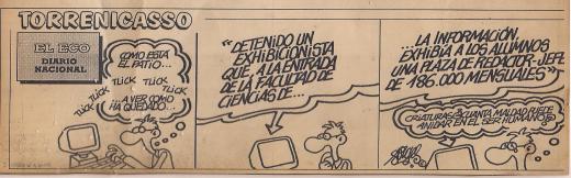 Velay, ha sido visionario y precursor: hoy admiramos el ingenio desinformativo de El Mundo Today, que en realidad es una brillante y actualizada versión del analógico y televisivo Deforme Semanal: “Presta declaración el conductor de la E.M.T. acusado de sonreírle supuestamente a un viajero”. ¿Y cuánta Historia no hemos entendido mejor y con la mente más abierta, leyendo Los Forrenta o la Historia Forgesporánea, que en tomos de prosa infumable o en bocas de profesores muy pesados o decididamente tendenciosos? Y periodista, porque no tendría el título ni ejerció propiamente, pero vivió siempre en los medios -empezando como técnico en TVE-, sabía cómo funcionaban, tenía ese mismo instinto innato y, sobre todo, conocía muy bien la profesión, lo que sentía y padecía. Esta viñeta tendrá 30 años, y casi esos mismos lleva prendida en la pared de mi habitación.
