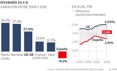 Cualquiera que esté un poco documentado sobre el asunto sabe que, en investigación, desarrollo e innovación (por sus siglas I+D+i), España queda muy por debajo de los países con los que le corresponde compararse. Sí, nos viene de los ancestros, de Unamuno a nuestros días, pero no hemos hecho nada por invertir la tendencia. Si bien durante la primera década de este siglo se realizó un modesto esfuerzo, y se consiguió que la inversión pública y privada en I+D+i se acercara al 1,5% de nuestro PIB, a partir de 2009 no ha hecho más que menguar y diluirse. Hasta el ínfimo 1,19% que representa hoy, según datos del INE de finales de 2017.