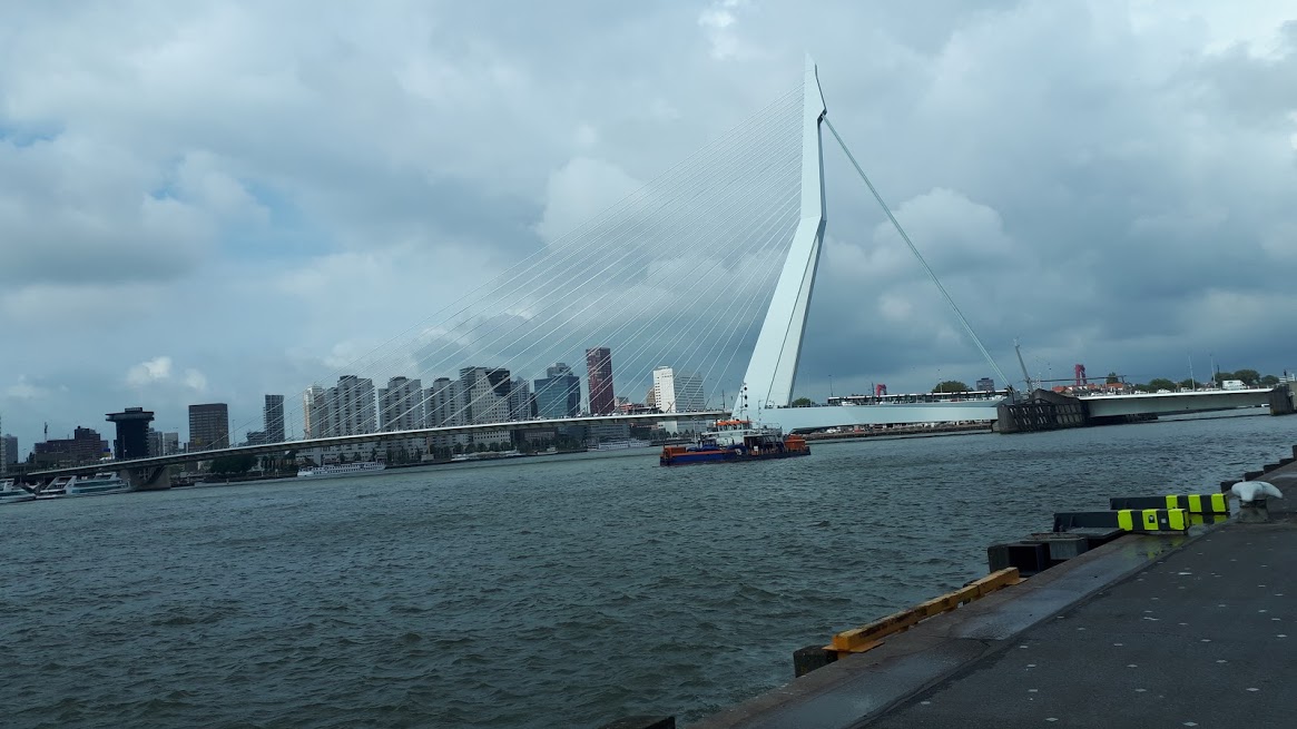 Portentosa arquitectura es también el Puente de Erasmo, pero además es otra cosa. No podían quizás haber encontrado mejor expresión que un puente para evocar la figura de Erasmo de Rotterdam. Una lástima que su pensamiento parezca tan poco presente entre los pensamientos que predominan hoy, y no se le tenga mucho en cuenta, más allá de las renombradas becas, de esta sensacional obra pública o de la estatua erigida frente a la iglesia de San Lorenzo, de la que era párroco su padre. En su tiempo, pero desde luego en este, necesitamos puentes y personas que sepan tenderlos. Cruzarlo despacio y a conciencia, en un sentido y después en el otro, será casi un acto solemne y un ejercicio de fe. Y será cierto que, parados en la orilla norte del río, tendremos la sensación de estar viendo quizás una miniatura del skyline de Nueva York.