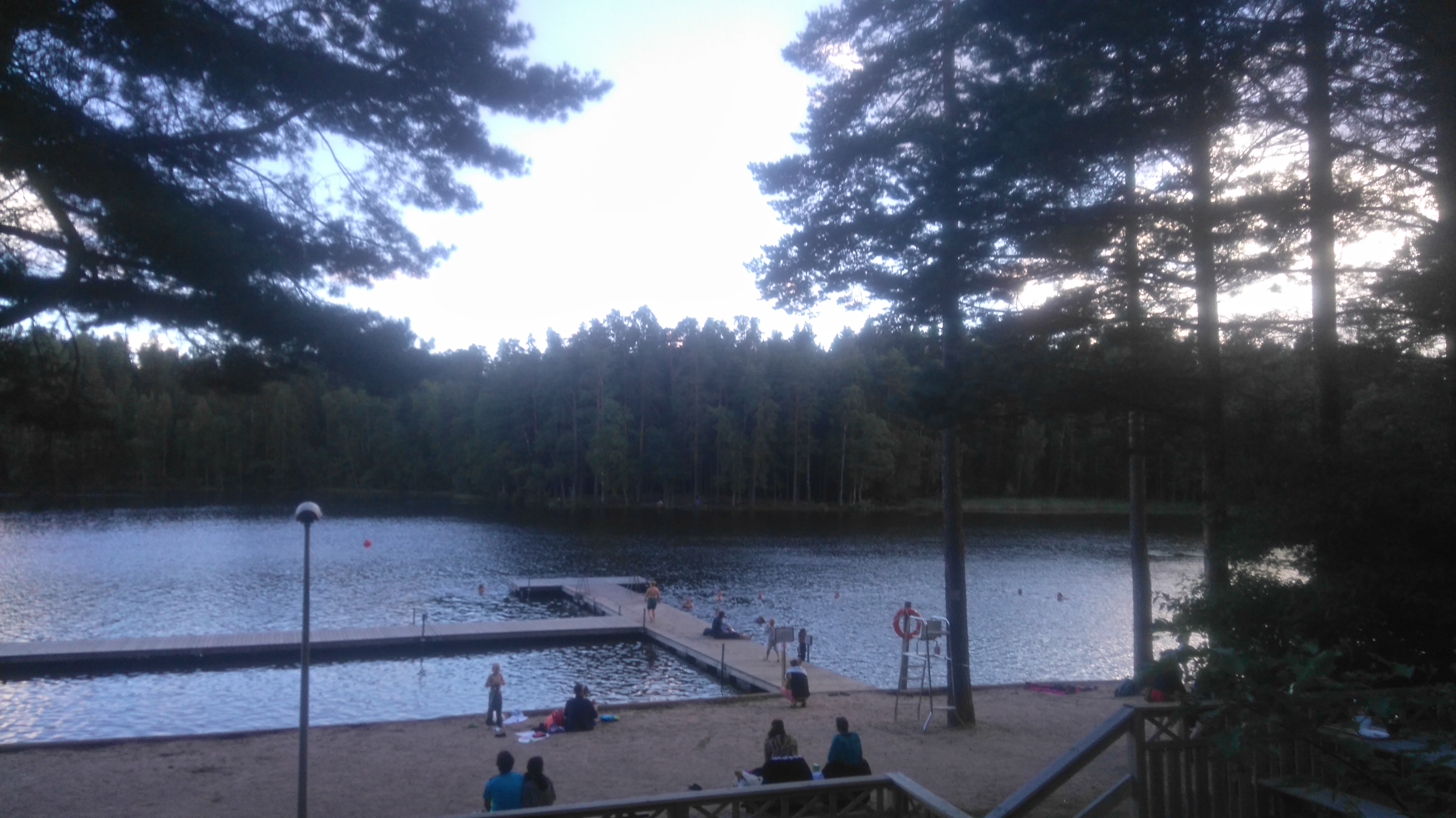 Cuando se llega, el lago se ve verde, prometedor, rodeado de bosque. Según te aproximas, y sobre todo al avanzar por la pasarela que te adentra hacia una zona de mayor profundidad, esa agua se ve muy negra. Te invaden las dudas. Pero te prometieron que, debidamente preparado el cuerpo, aquello no tendría por qué ser un suplicio. Y es verdad. Una vez has pasado por la sauna, puedes bañarte en esa agua tan fría casi como si tal cosa. Claro, esto sólo puede suceder en Finlandia.