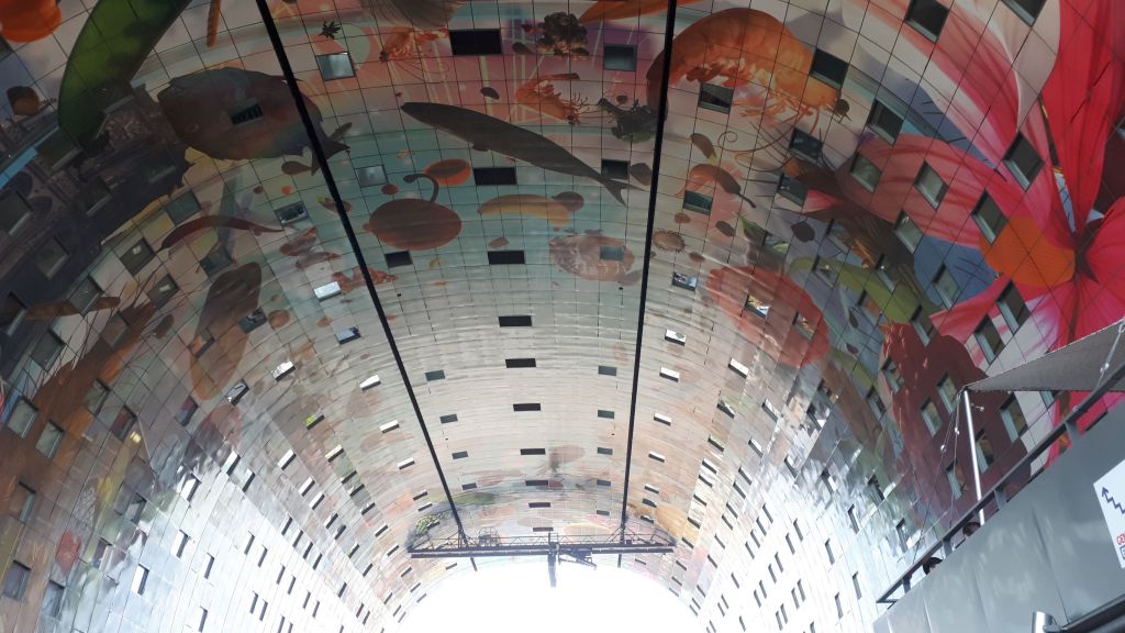 Pero volvamos al principio, estamos en el Markthal. Por fuera parece un hangar de naves espaciales, por dentro un templo, aunque los frescos del curvo techo ya le indican a uno que el único culto que se profesa ahí es a la comida. No había más puesto de especias que el referido, pero no debía faltarle de nada, teniendo en cuenta que lo oriental está bastante integrado en la cultura de los Países Bajos y también en su gastronomía. Por lo demás, quesos de todas las clases ¡y colores!, infusiones de todos los orígenes posibles, viandas, dulces, pescados, imprescindibles los arenques… pero no todo era autóctono. Vean en la foto que el primer puesto a la entrada es de ibéricos, y aunque aquí no se ve, les prometo que a la derecha había uno de pinchos vascos.