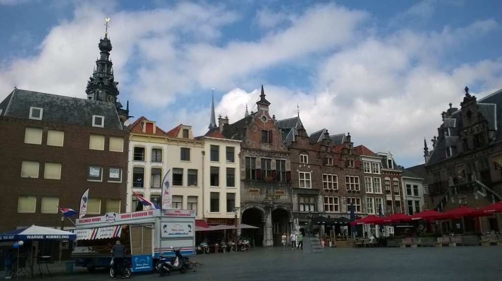 Todo para contar que la excursión nos llevaba a Nimega, una ciudad tranquila, aparentemente ajena a todo este mejunje. Con su colorido, su ayuntamiento gótico, su plaza del mercado… todo muy típicamente neerlandés, en contraste con el paisaje y fisonomía alemanas que dejábamos detrás y a los que habríamos de volver.